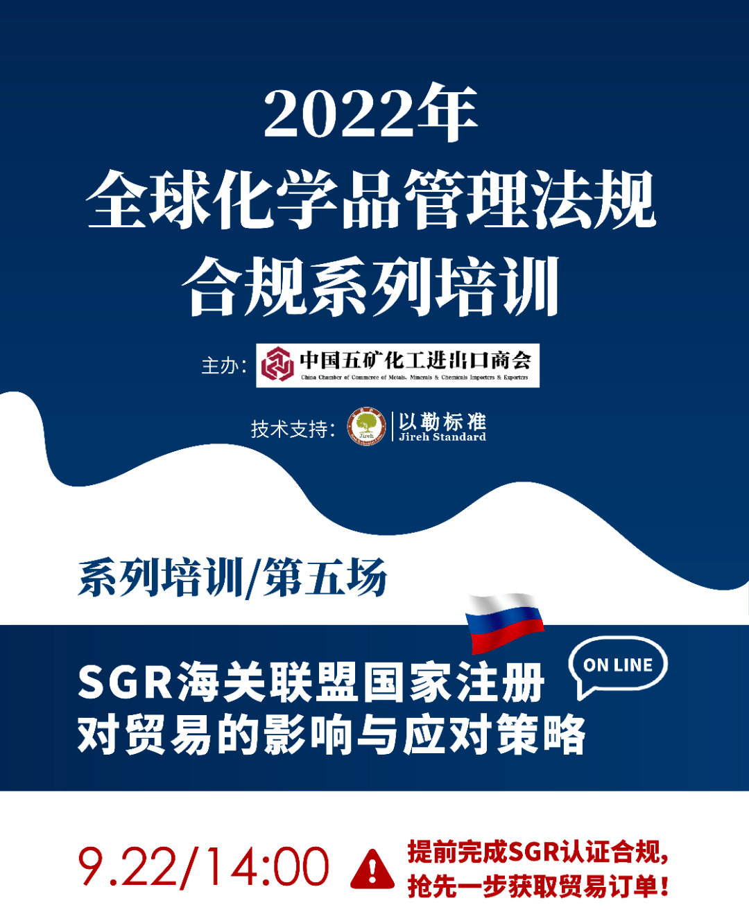报名倒计时!明天下午2点,以勒标准联合五矿商会共同举办的全球化学品管理系列法规的第五场——SGR海关联盟国家注册对贸易的影响与应对策略正式开讲!
