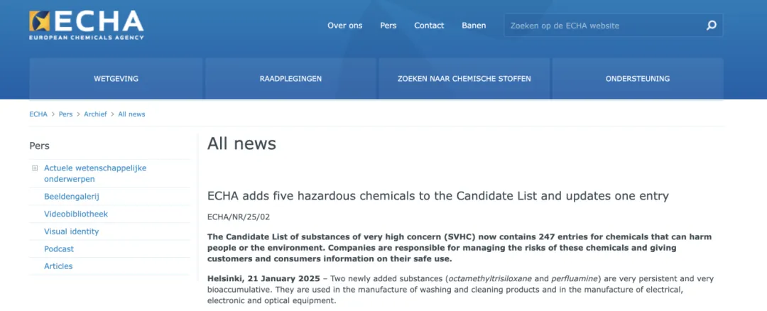 2025年1月21日,欧洲化学品管理局(ECHA)正式为其高度关注物质(SVHC)清单(又称:授权候选物质清单)新增5种物质并修改1项条目内容,进行共计6项更新。