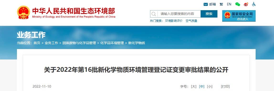按照《中华人民共和国政府信息公开条例》(国务院令第711号)的要求,现将2022年第16批新化学物质环境管理登记证变更审批结果予以公开。